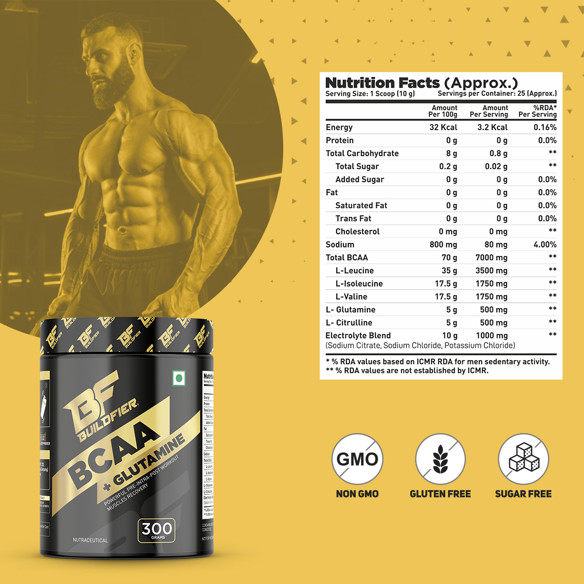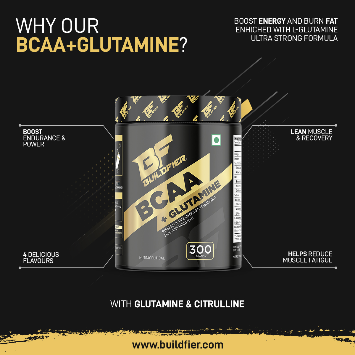 Buildfier BCAA Is a PRE-INTRA-POST workout That Includes (700mg) of Fermented BCAA for instant recovery, (500 mg) Glutamine to support muscle breakdown, (500g) Citrulline for Improving athletic performance its also acts as vasodilator which helps widen the veins and increase blood flow and 1000mg Electrolyte blend which improves athletic performance, rehydration during illness, better recovery, healthy cell function, and heat stroke prevention.