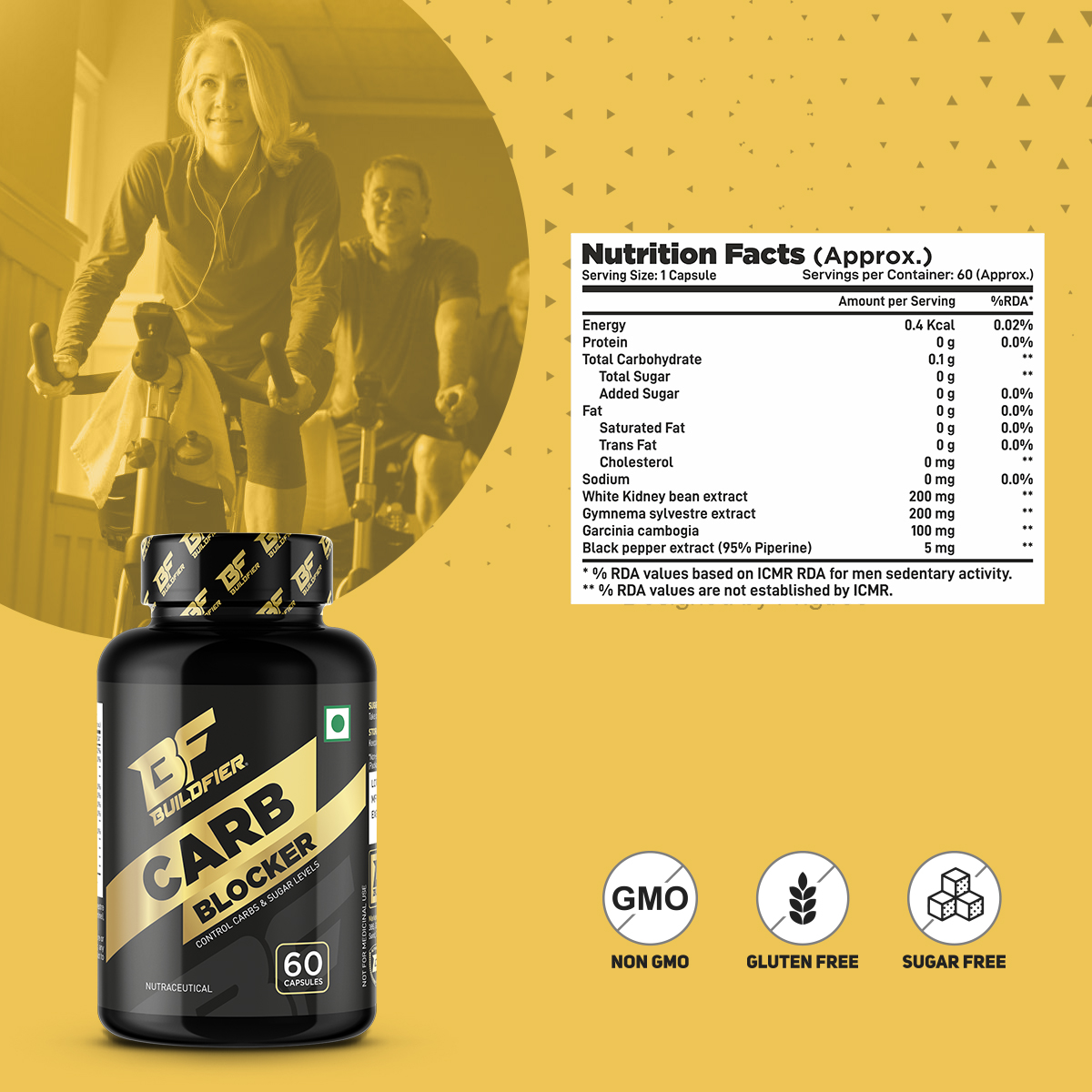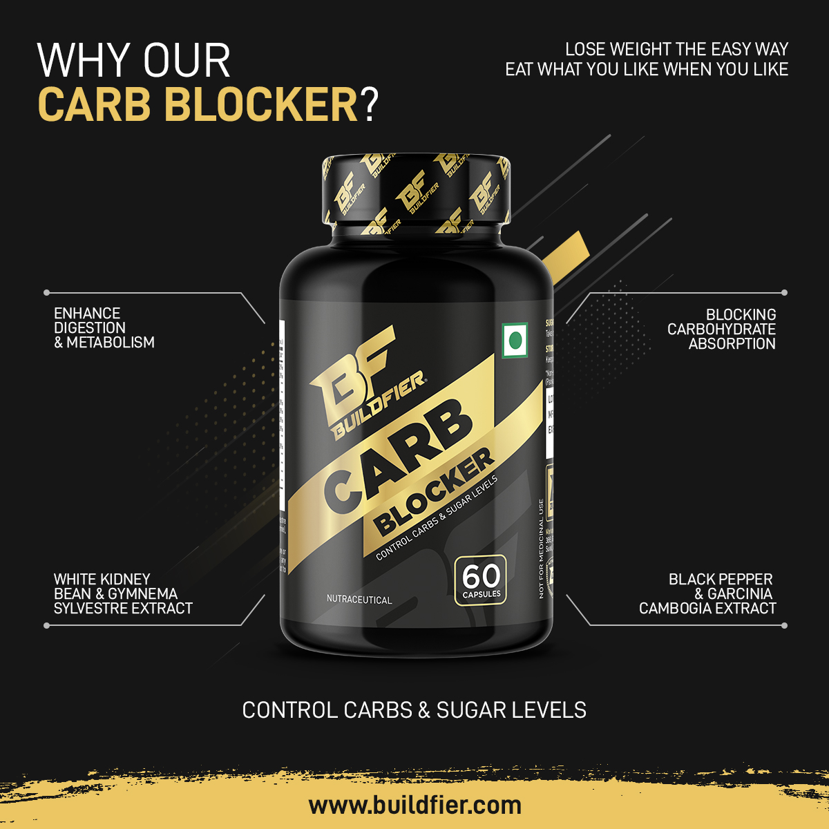 Buildfier Carb blocker Blocks Carbohydrate Ab- sorption, Enhance Digestion and Metabolism. With white kidney bean extract (200mg) reduces carb absorption, assisting with starch blocking, which results in effort free weight management with garcinia cambogia (100mg) blocks your body's ability to make fat and it puts the brakes on your appetite.