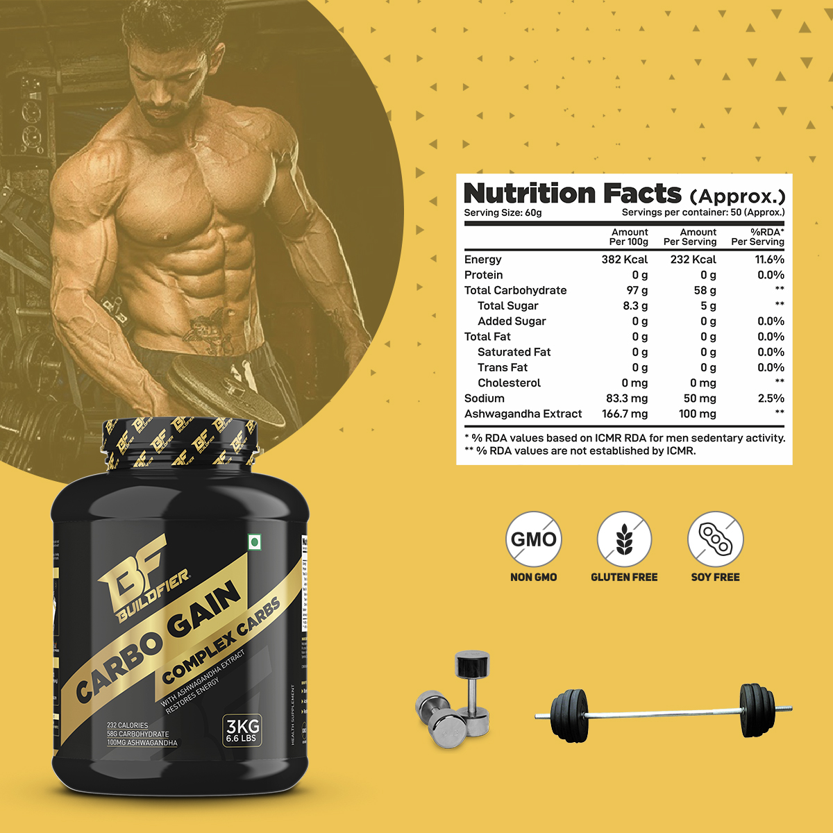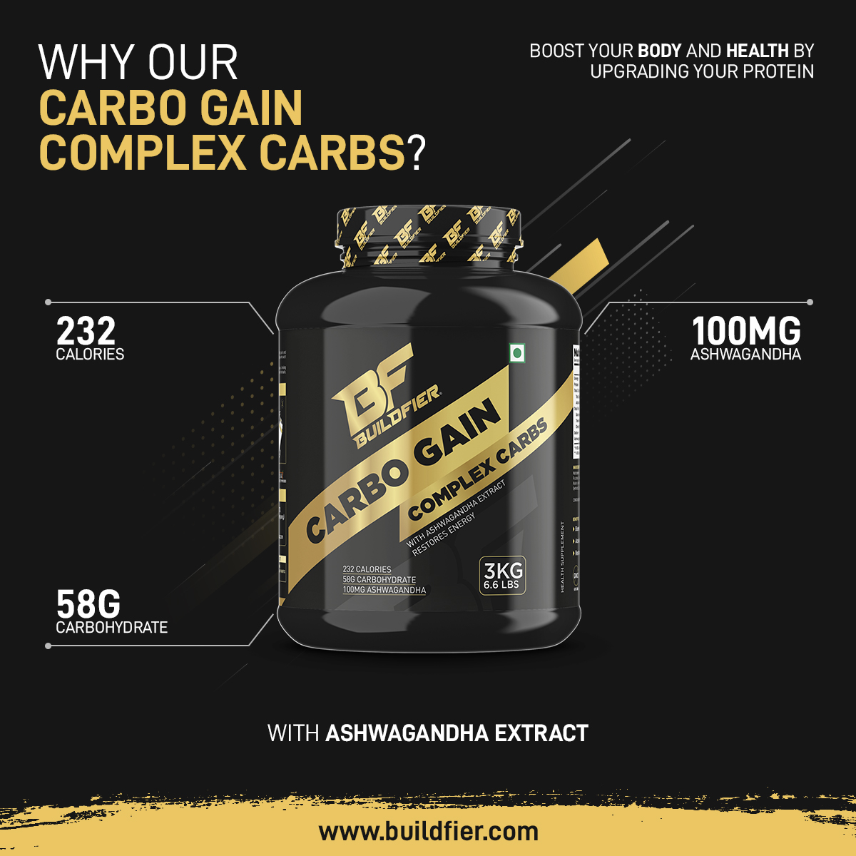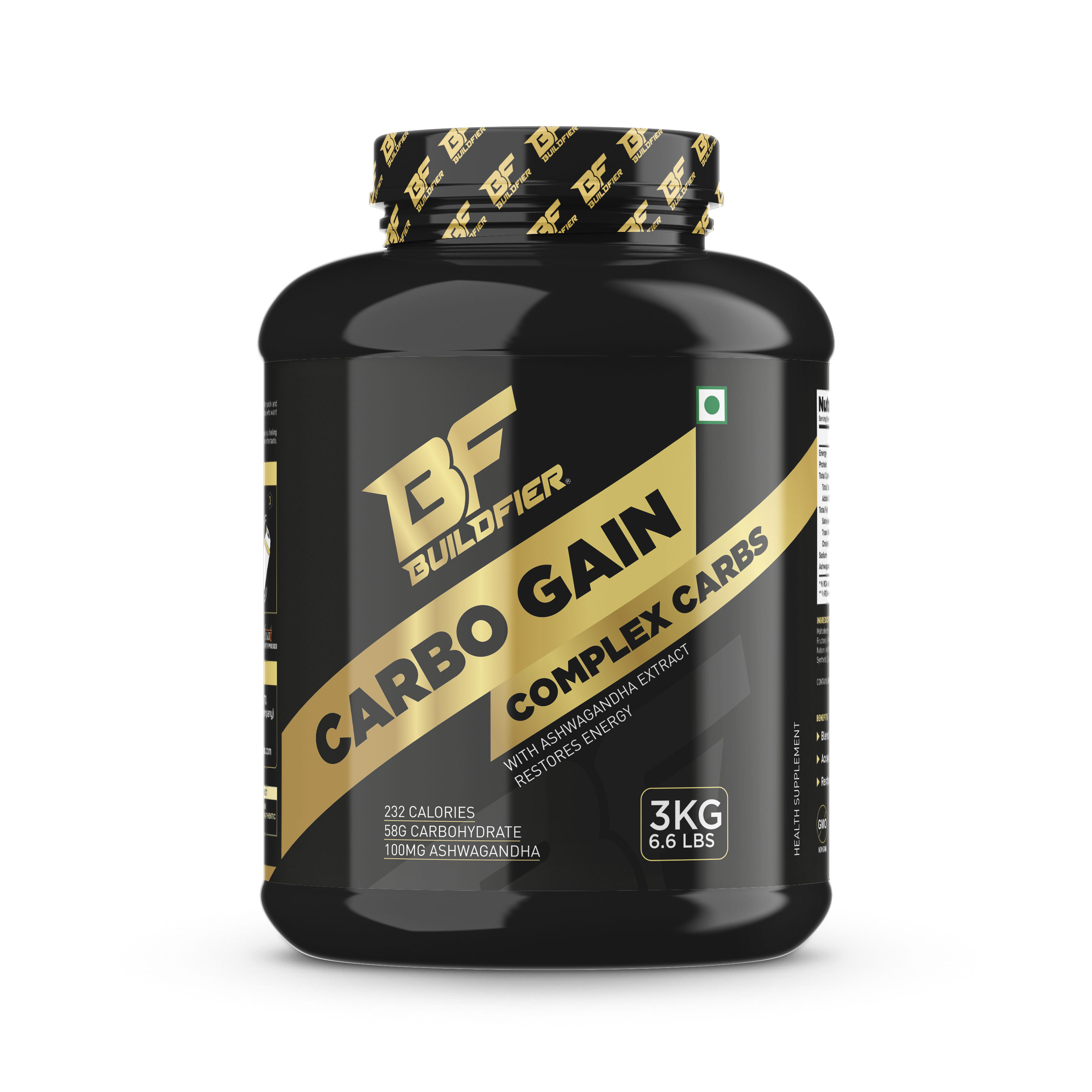 Buildfier Carbo Gain is a simple & complex Carbo- hydrates, 1 scoop Of Carbo Gain provides 232 Kcal and 58 g carbohydrate in each serving (60g) can help assist in muscle mass Gain, It can be used as pre or a post workout supplement. Ashwagandha contains chemicals that might help calm the brain, reduce swelling, lower blood pressure, and alter the immune system.