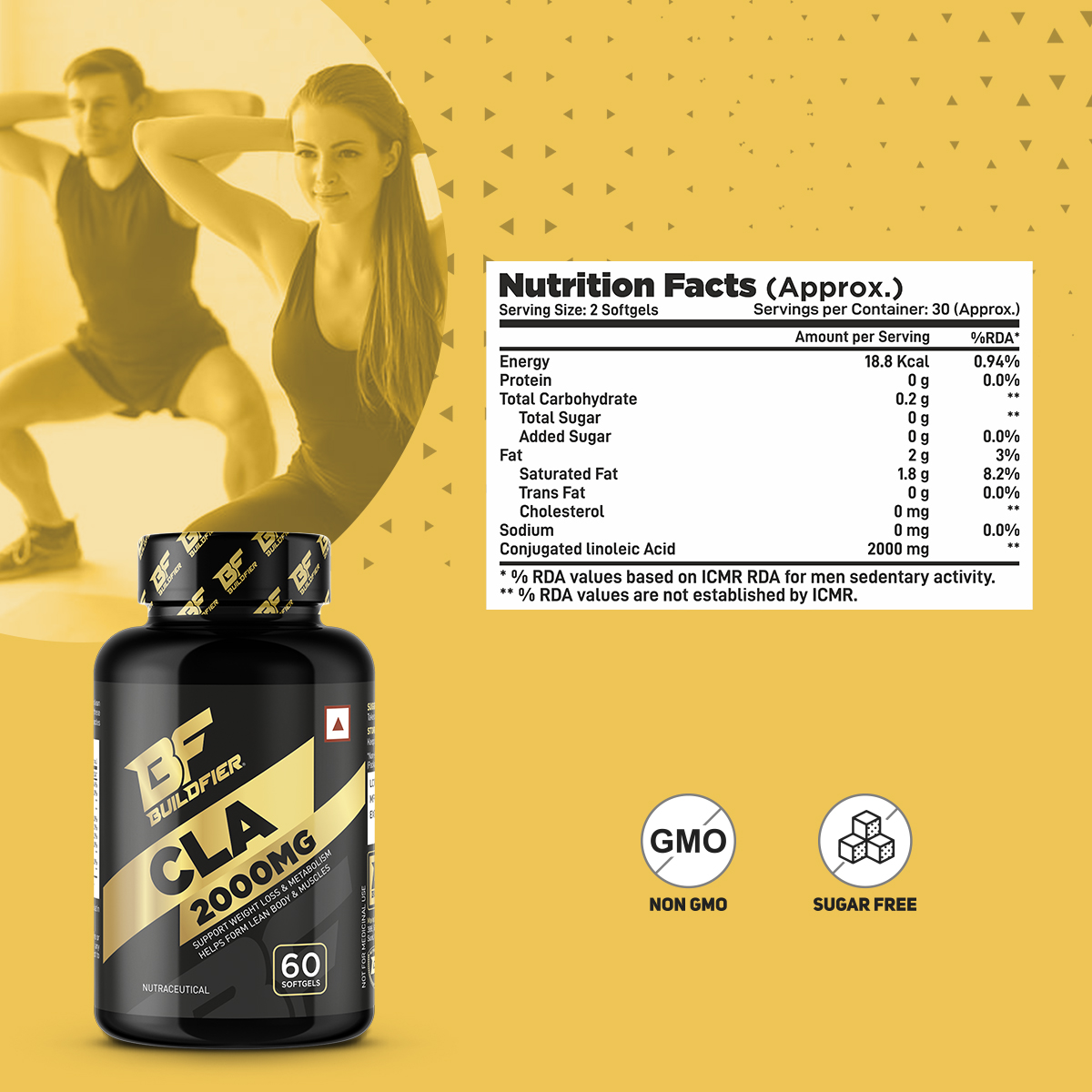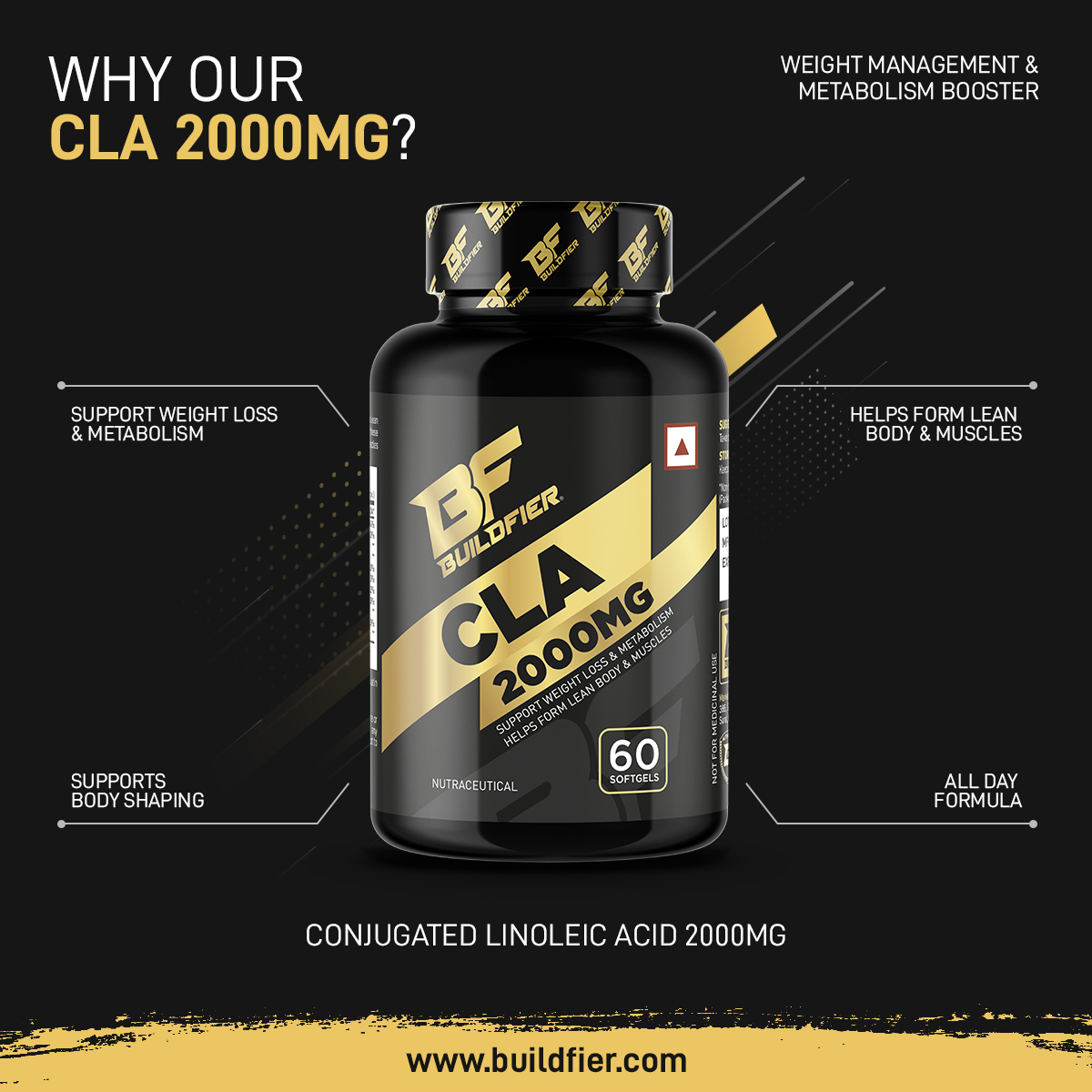 Buildfier Conjugated linoleic Acid (CLA-2000mg) is a fatty acid found in meat and dairy that is believed to have various health benefits with no cholesterol. it helps reduce fat and Helps form lean body, Build Muscle and increase energy.