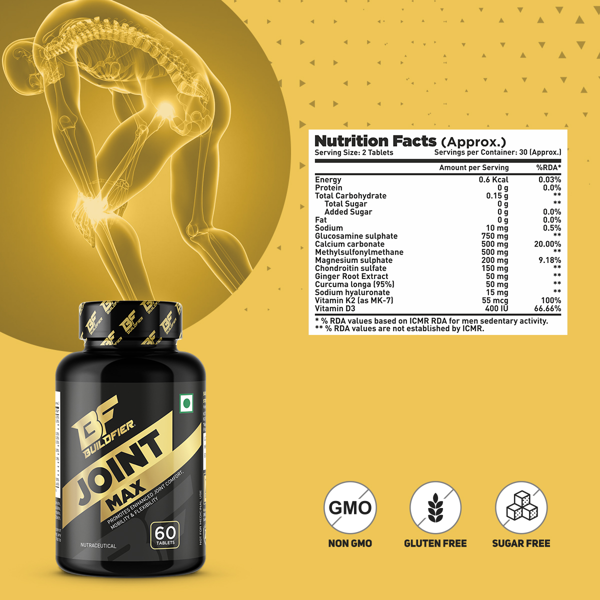 Buildfier Joint Max contains 10 proven Powerful Herbs & Nutrients such as Curcuma longa, Ginger Root extract, Vitamin K2 (as MK-7) increases bone mineral density and promotes bone quality and strength which all together supports cartilage repair, enchances joint flexibility for Osteoarthritis.